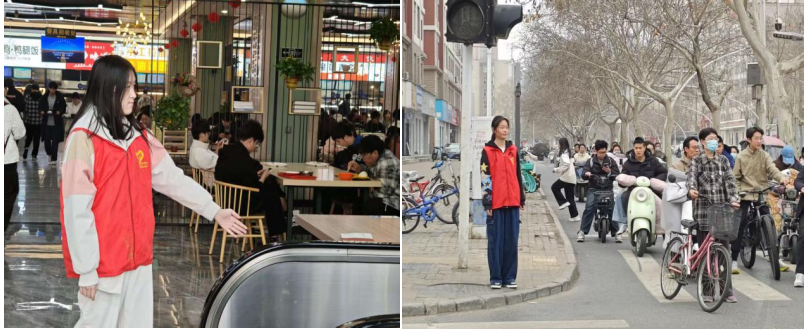 本次志愿服务系列活动围绕校园文明引导、城市环境保护、交通秩序维护三项主题展开。在校园餐厅,志愿者们身着统一服装,在就餐高峰时段坚守于电梯口、取餐区和餐具回收点,耐心引导同学们有序排队、文明用餐,以细致入微的服务营造出更加温馨、整洁的就餐氛围。在郑州青少年公园,志愿者们分组行动,手持夹钳、垃圾袋等工具,对步道、绿化带及卫生死角进行细致清理,捡拾烟头、纸屑、塑料瓶等废弃物。同时,他们还主动向过往市民宣传环保知识,倡导绿色低碳生活方式,用一次次弯腰践行生态文明理念,用一句句讲解唤起市民的环保意识。在城区主要路口,志愿者们身穿红马甲,在交警的指导下开展文明交通劝导。面对试图闯红灯的行人和逆行的非机动车,他们耐心劝阻、礼貌引导,遇到老人和孩子过马路,他们主动上前搀扶护送。那一抹抹流动的“志愿红”,成为街头一道温暖而亮眼的青春风景。